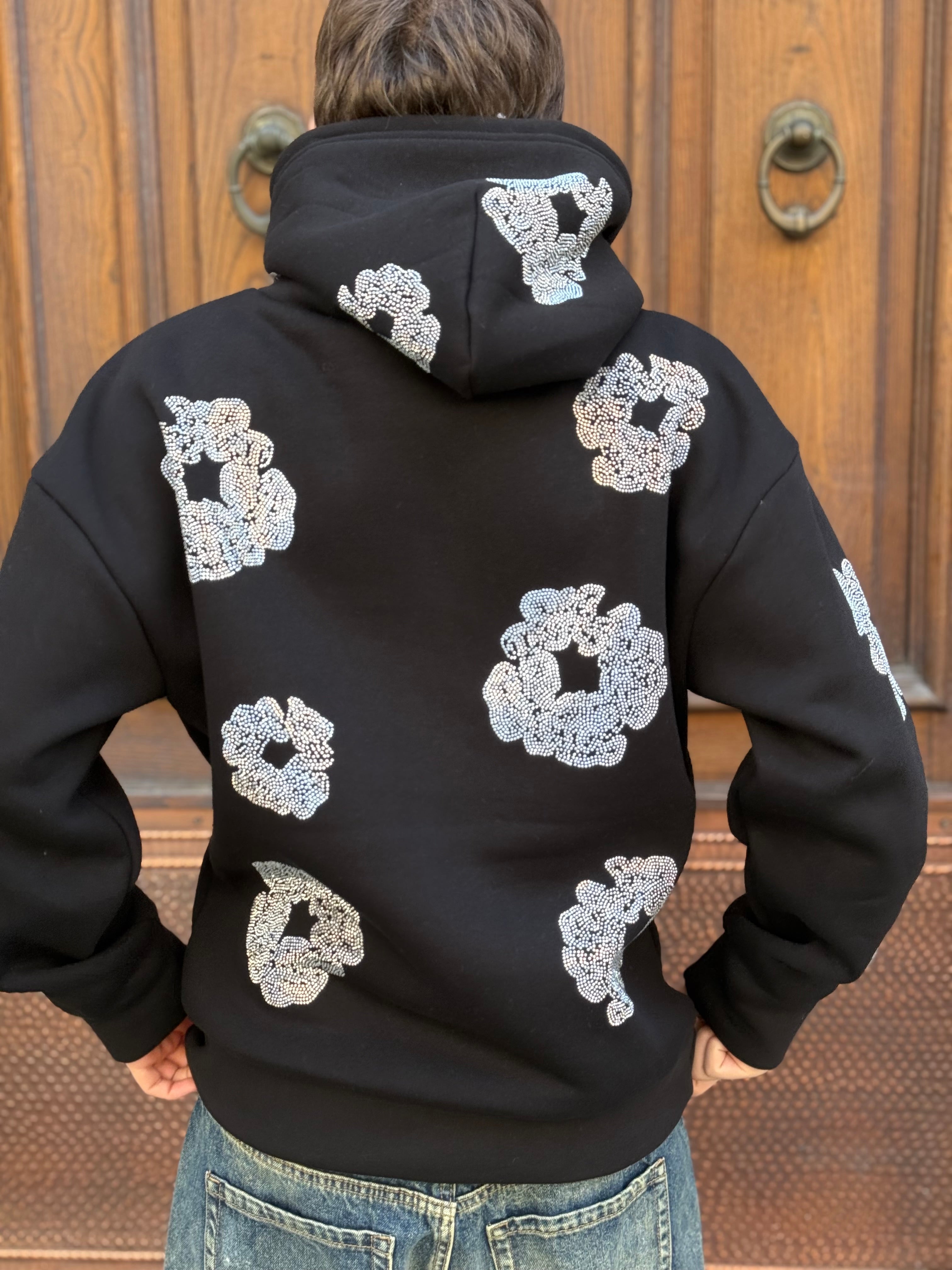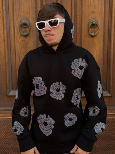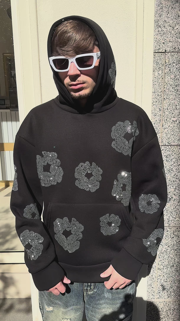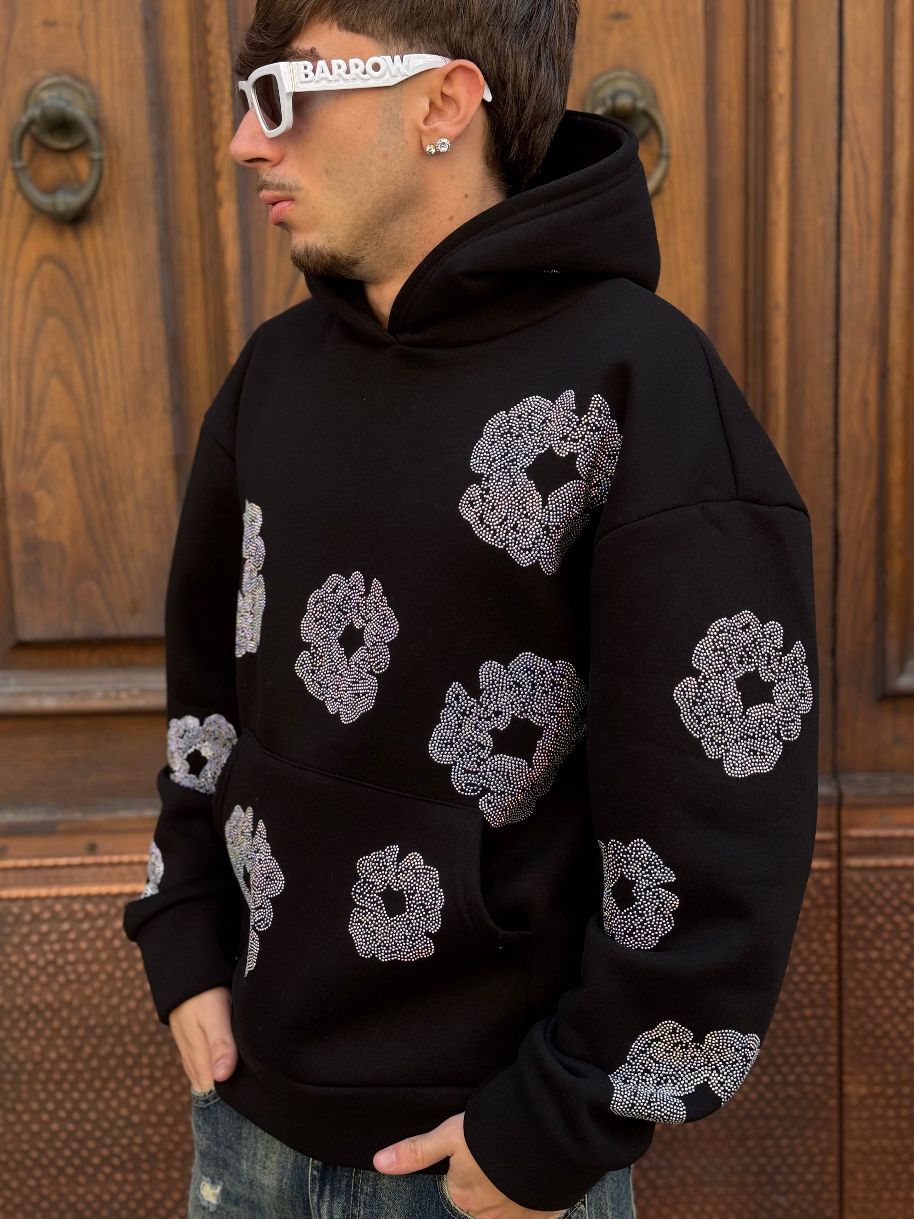 Felpa nera Brillantinata FIORI DIAMOND con cappuccio boxy fit made in italy