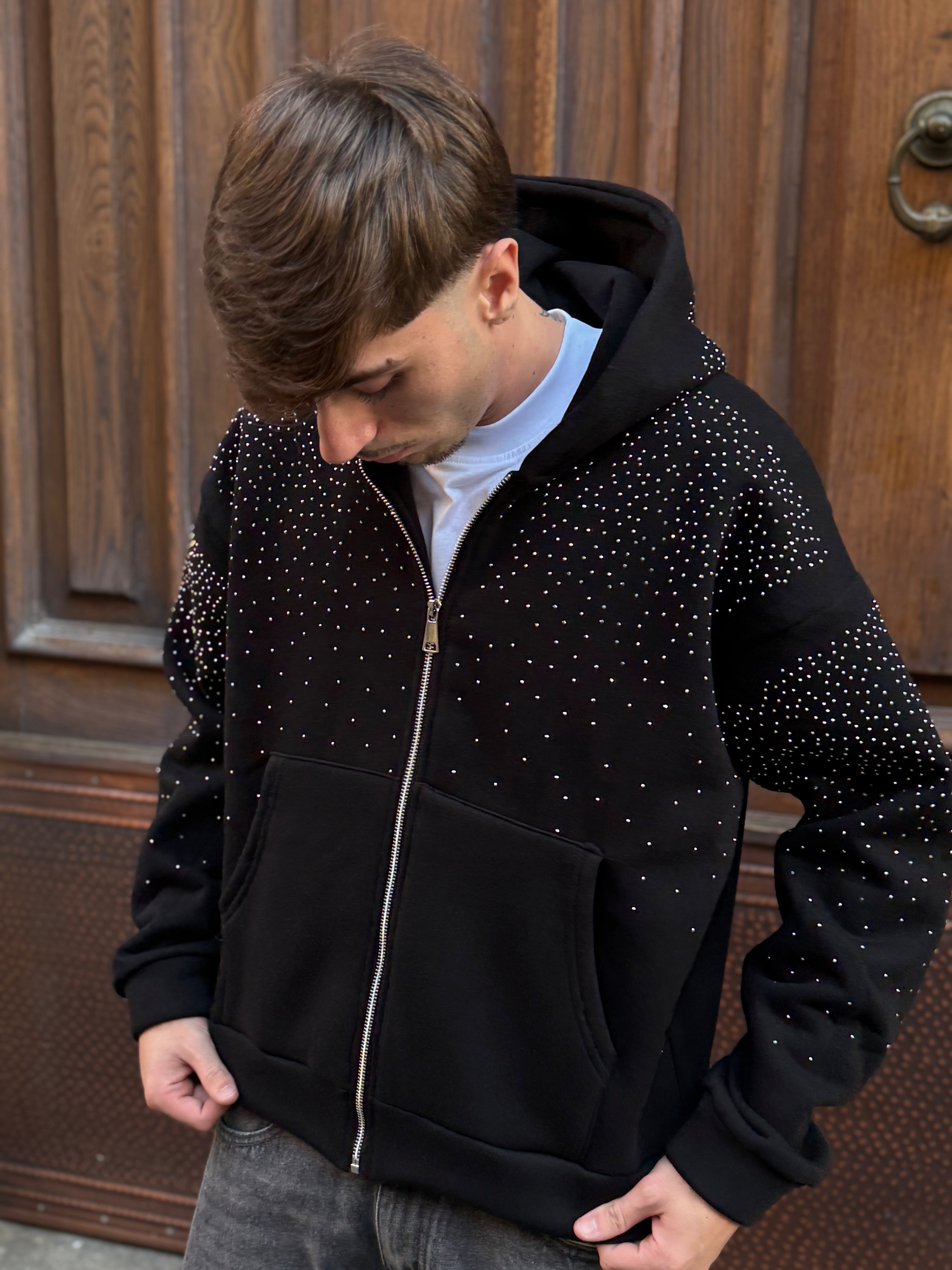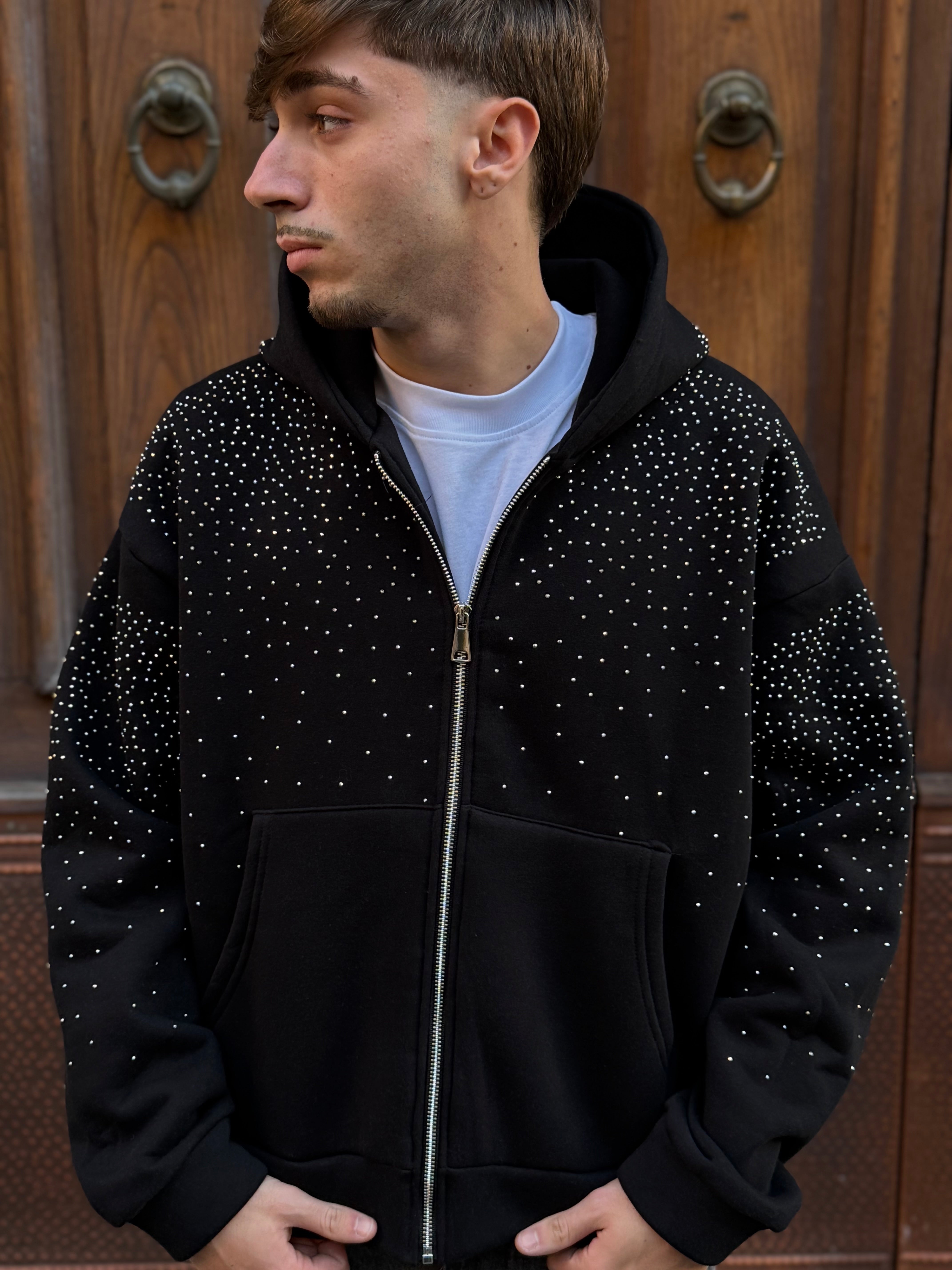 Felpa nera DIAMOND Brillantinata con capuccio boxy fit made in italy