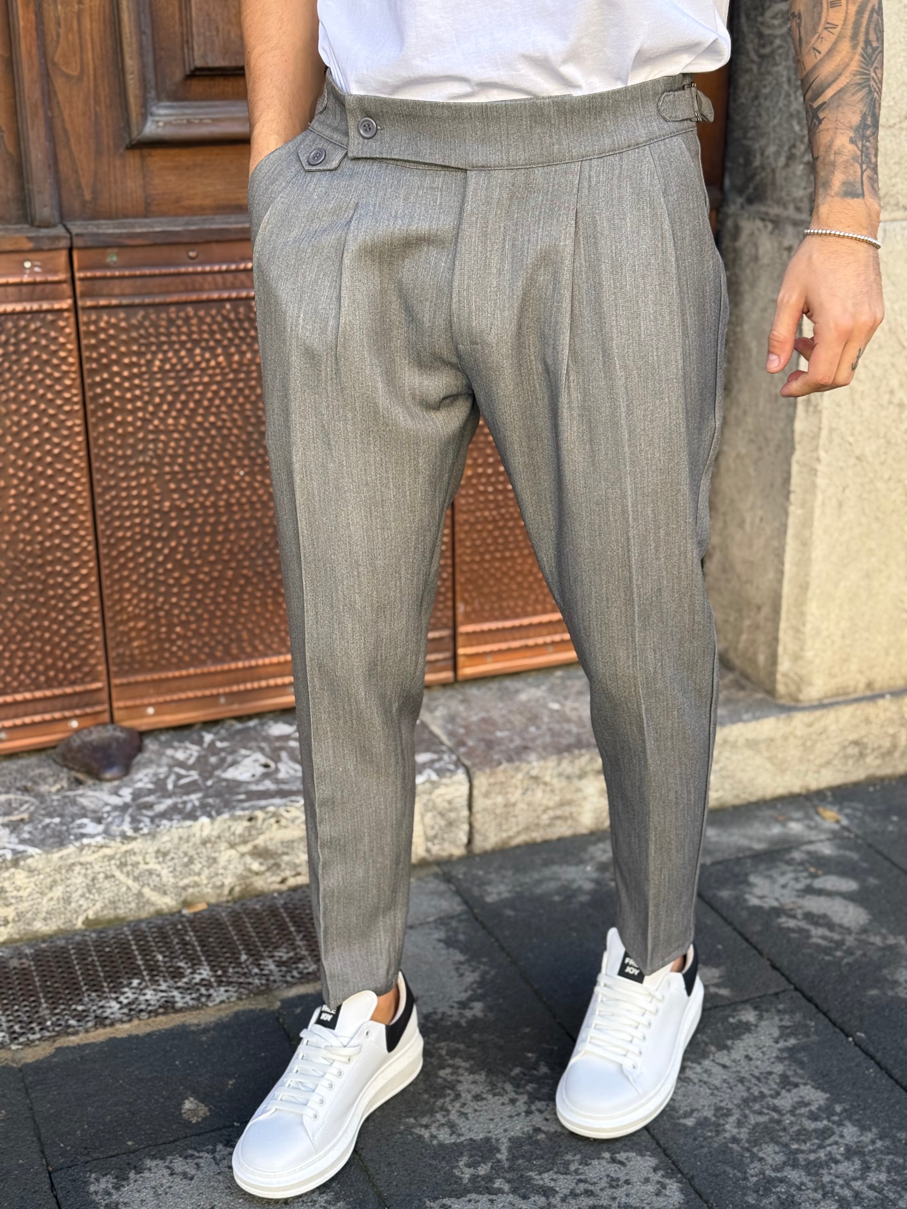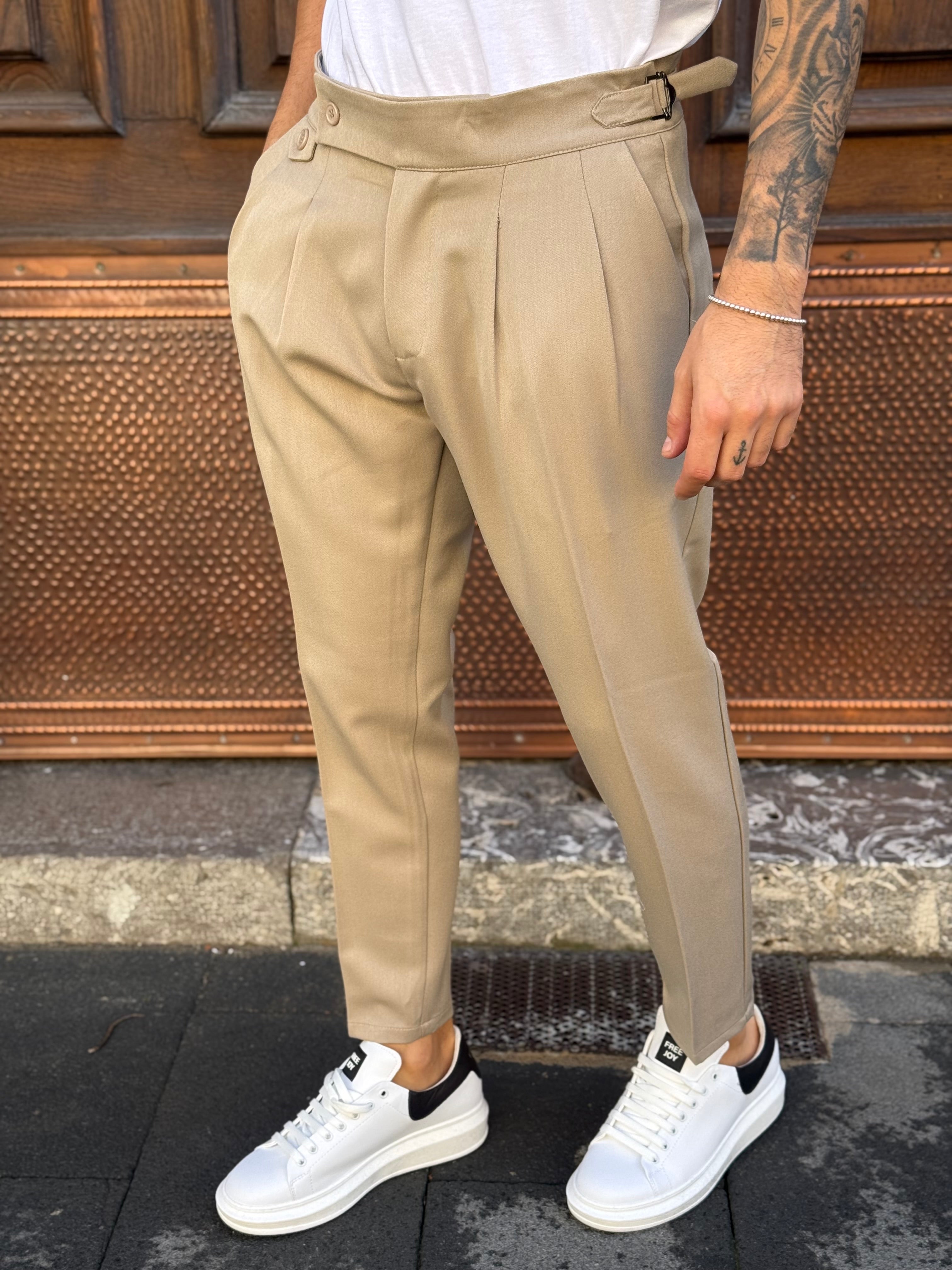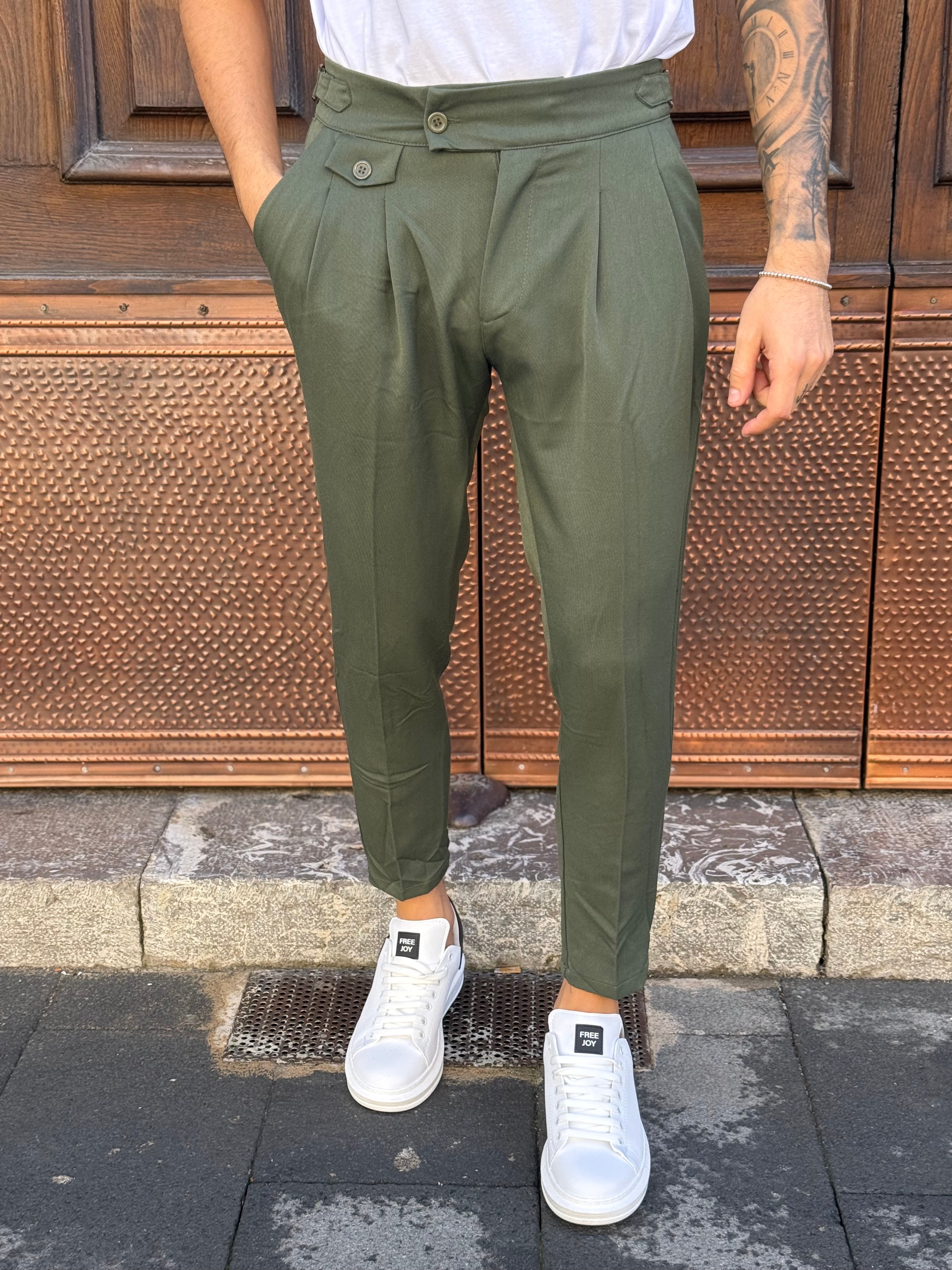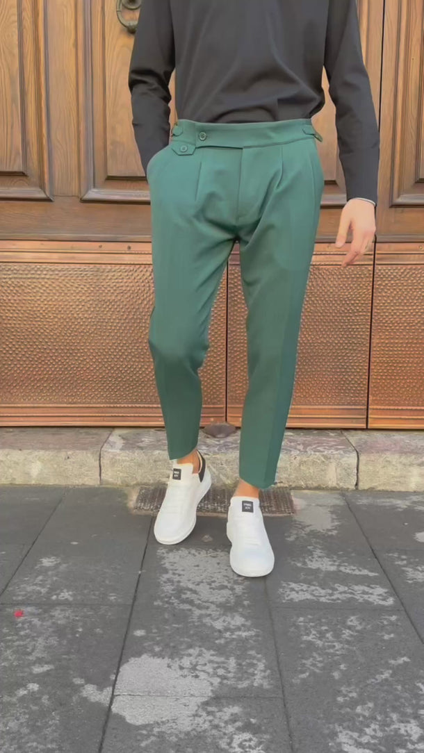 Il pantalone sartoriale vita alta, un bottonie con due fasce laterali e disponibile in vari colori, è perfetto per chi ama prendere rischi. Aggiungi un tocco audace al tuo guardaroba! Fatti notare con questo capo di alta qualità, che ti farà sentire sicuro e pronto ad affrontare ogni sfida con determinazione!